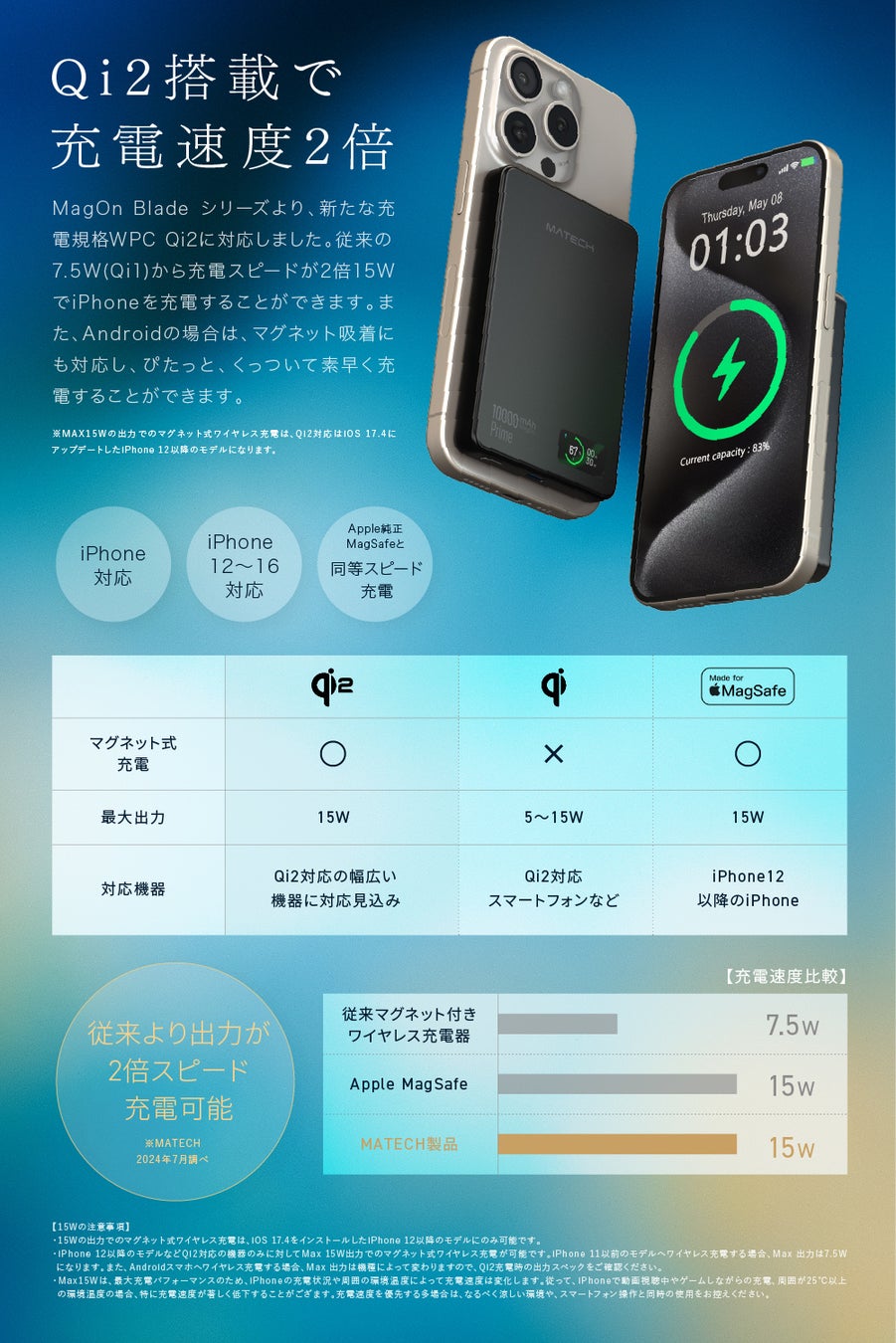 新規格Qi2(最大15W)に対応し、従来のQi1(7.5W)より約2倍の充電スピードを実現。