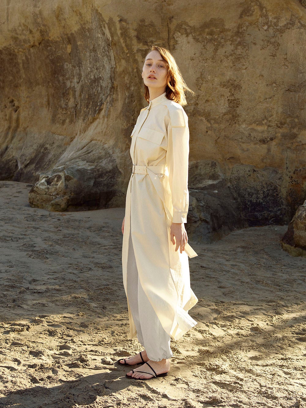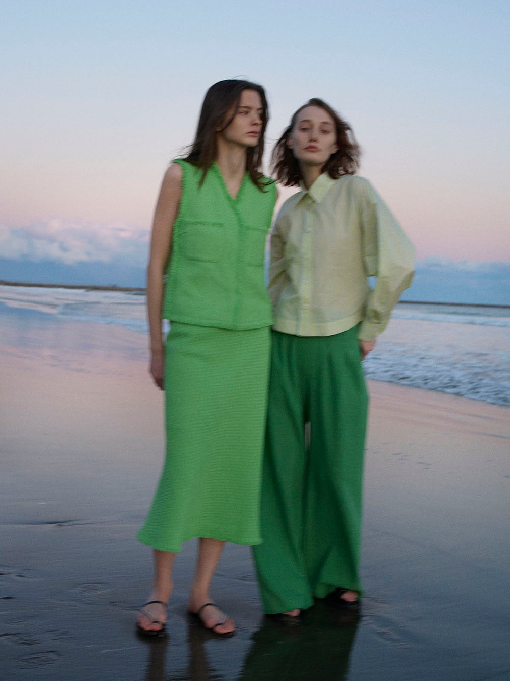 流動的なライフスタイルや気候に対応したフレキシブルでフリー、上品でモダンなニューワードローブ。ポジティブなカラー、センシュアルなディティール、シアー、レイヤード、スリーブコンシャスなトップスなどオフィスにもデイリーにも着用できる軽やかで都会的なスタイルを提案します。