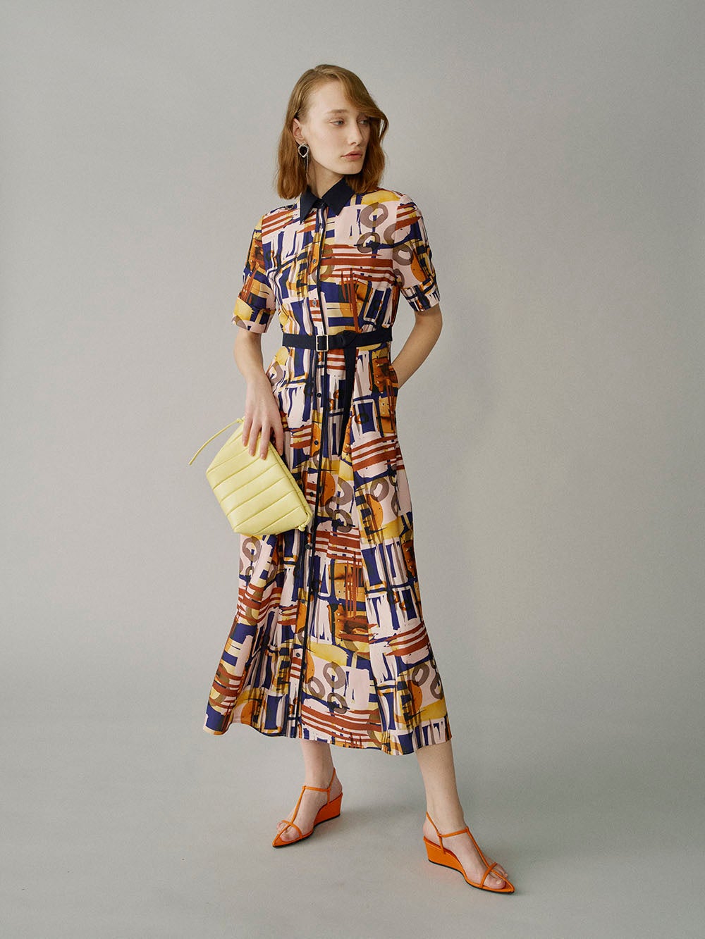 モダンアート風の柄感と迫力あるカラーリングが特徴のシャツワンピース。衿とウエストマークで配色を効かせ、きちんと感のあるレディなシルエットに。