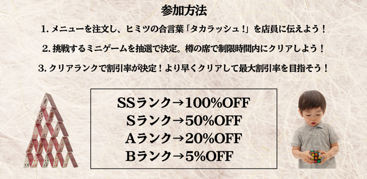 挑戦するクエストはトランプやパズル、知恵の輪、ブロックなど種類や難易度も様々。制限時間内に、より早くミニゲームをクリアして最高ランクSS(お食事完全無料)をGETしてください。週末は「ENOSHIMA TREASURE CAFE」へ‼皆様のご来店、お待ちしております。