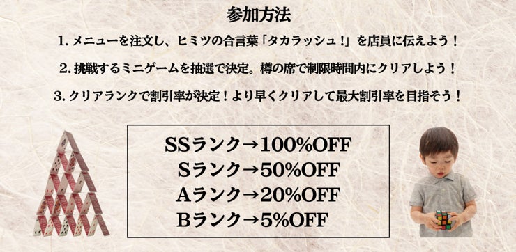 体験型コンテンツ「リアル宝探し」の企画・制作・運営を手がける株式会社タカラッシュ(本社:東京都品川区、代表取締役:齊藤 多可志、以下タカラッシュ)は、エンターテイメントカフェとして江の島で運営しているリアル宝探し施設「ENOSHIMA TREASURE CAFE」で、ミニゲームをクリアしてお食事代を最大100%割り引くクエスト「Weekend Challenge」を10月29日(土)より実施いたします。