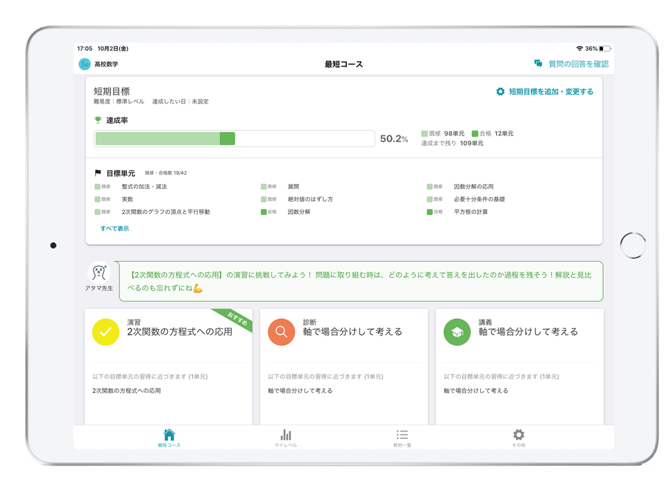高等学校の「数学」の各単元のうち、学部が指定する単元をAI学習システムで学ぶ。