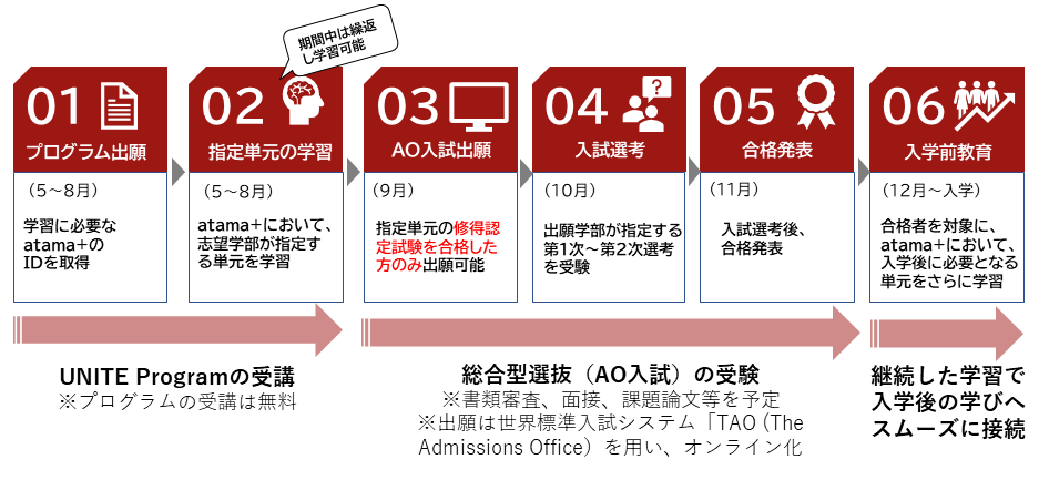 総合型選抜(AO選抜入学試験)の出願要件として導入する、AI学習システムで、各学部が指定する教科の単元を学習・修得するプログラム。期間中は繰り返し学習可能。プログラム出願無料。