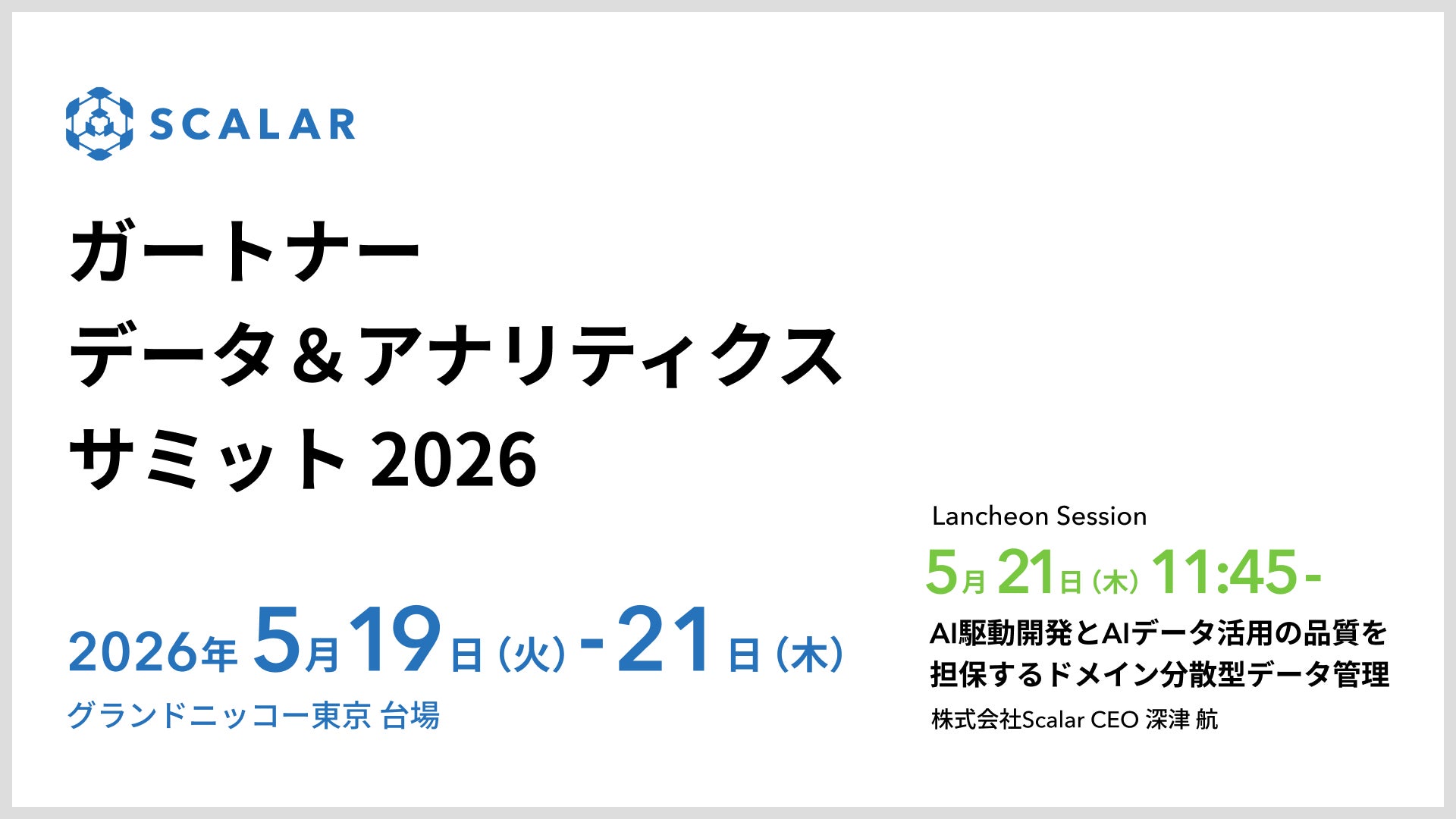 株式会社Scalar(本社:東京都、代表取締役CEO:深津航、代表取締役CTO:山田浩之、以下「Scalar」)は、2026年5月に開催される「ガートナー データ&アナリティクス サミット 2026」に出展し、展示ブースの出展およびランチョンセッションでの講演を実施いたします。