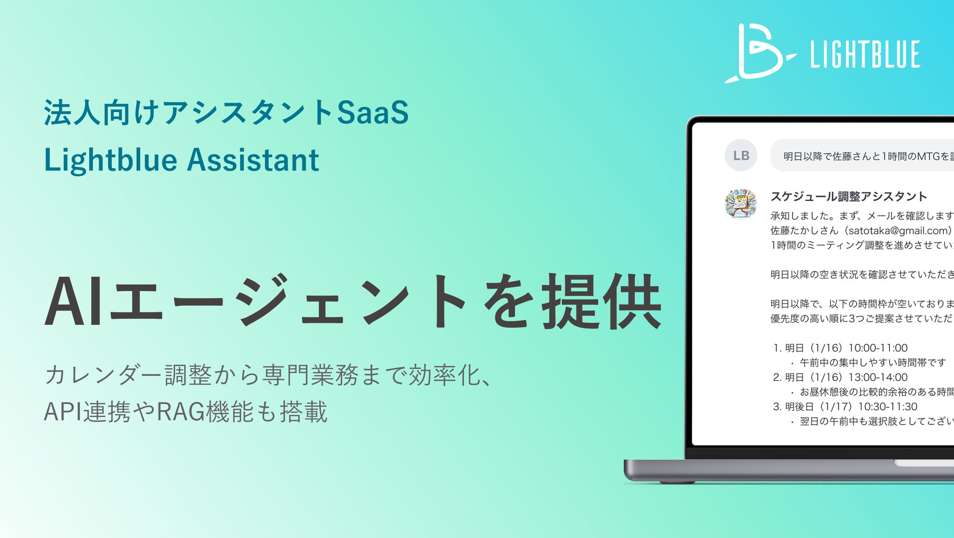 東京大学発、最先端アルゴリズムの現場実装に取り組むAIスタートアップ 株式会社Lightblue(代表取締役:園田 亜斗夢、本社:東京都千代田区、以下「Lightblue」)は、企業向けAIアシスタント「Lightblue Assistant」において、業務を自律的に遂行するAIエージェント機能の提供を開始いたします。本機能により、従来のチャットボット型AI活用から一歩踏み込み、スケジュール調整や各種業務タスクを自動化する高度なサポートを提供し、さらなる業務効率化と生産性向上を実現します。