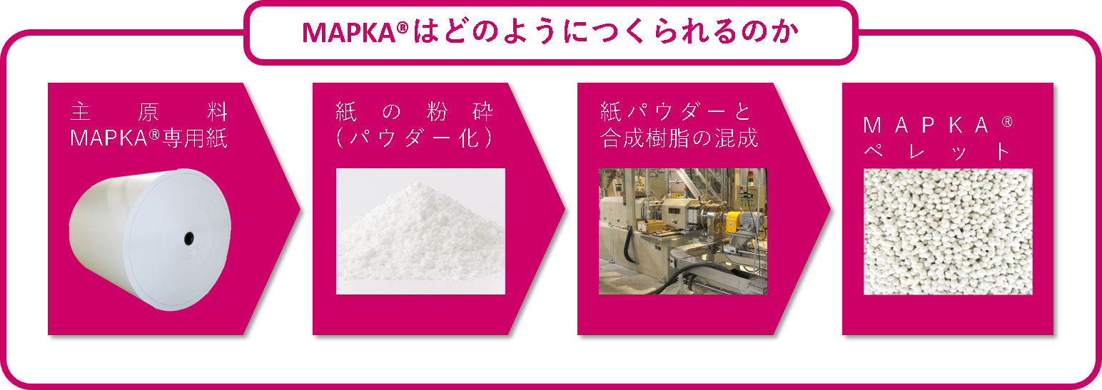 エコ素材「MAPKA」とは、紙をパウダー化し、紙パウダー51%、ポリプロピレン(PP)49%を混成させてできた、低収縮、高剛性、耐熱性が特長のバイオマス素材です。従来のプラスチック素材と同様に、射出成形や押出成形などの加工ができ、製品の製造工程を変更することなく石油化学原料の使用量を削減することが可能な素材です。 「MAPKA」の主原料はあくまで「紙」となり、世界でも類を見ない、MADE IN JAPAN の新素材として“ポストプラスチ ック原料”と呼ばれるほどに注目されており、使い捨て食品トレーや、食器、お箸など、脱プラが進むさまざまな商品において活用されています。