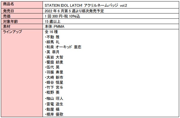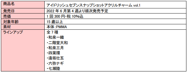 『マプカプセル』は、6 月に発売予定の「アイドリッシュセブンスナップショットアクリルチャーム vol.1」 「STATION IDOL LATCH! アクリルネームバッジ vol.2」の 2 商品から本格導入します。