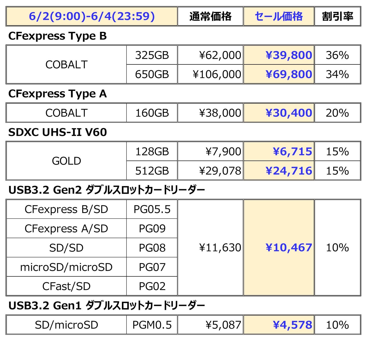 ProGrade Digital Inc.は、Amazonで6月2日朝9時から6月4日まで開催される【Amazonタイムセール祭り】で、CFexpress Type A COBALT 160GB, Type B COBALT 325GB/650GB, SDXC UHS-II V60 GOLD 128GB/512GBおよびカードリーダー全製品を、ProGrade Digital Inc.ストアにて、通常価格より10%-36%割引して販売します。