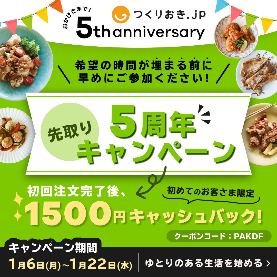 つくりおき.jp、5周年記念! 初めての方限定で1500円キャッシュバック「先取り5周年キャンペーン」を開始
