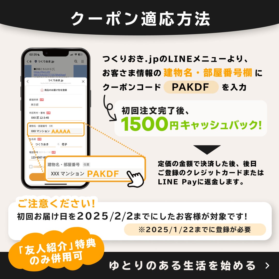 今回のキャンペーンでは、初めてつくりおき.jpをご利用される方を対象に、初回注文完了後1,500円をキャッシュバックいたします。この機会に、日々の家事負担を軽減し、ゆとりある生活をお楽しみください。