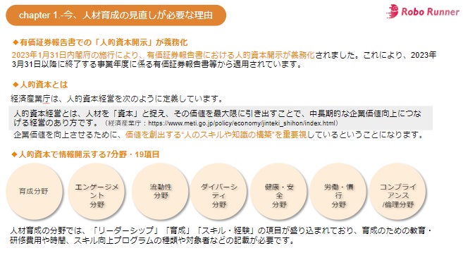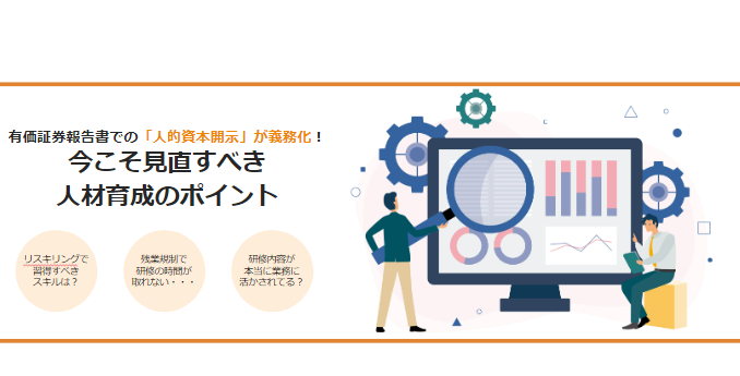 2023年3月31日より、有価証券報告書における人的資本開示が義務化されました。企業価値向上のためには、人材育成も重要な1つの要素として定められています。その影響から、人材育成の見直しが重要視されていますが、働き方改革により時間の制約や様々な課題もある中で、思うように進められない企業様も多いのではないでしょうか。