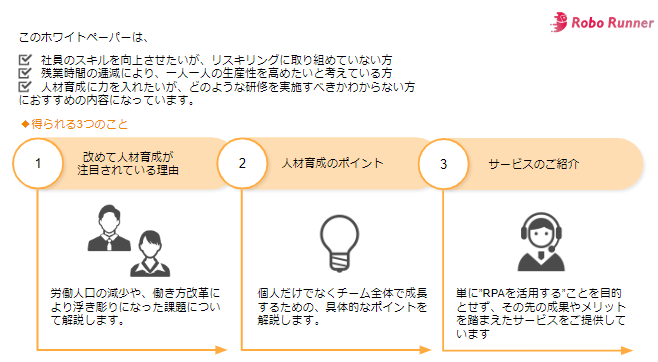 そこで当社は、これまで多くのRPA研修のご支援をしてきた実績から、研修内容を構築するためのポイントや、個人・チームでの成長を促すための教育方法などを分析し、本ガイドブックにまとめました。