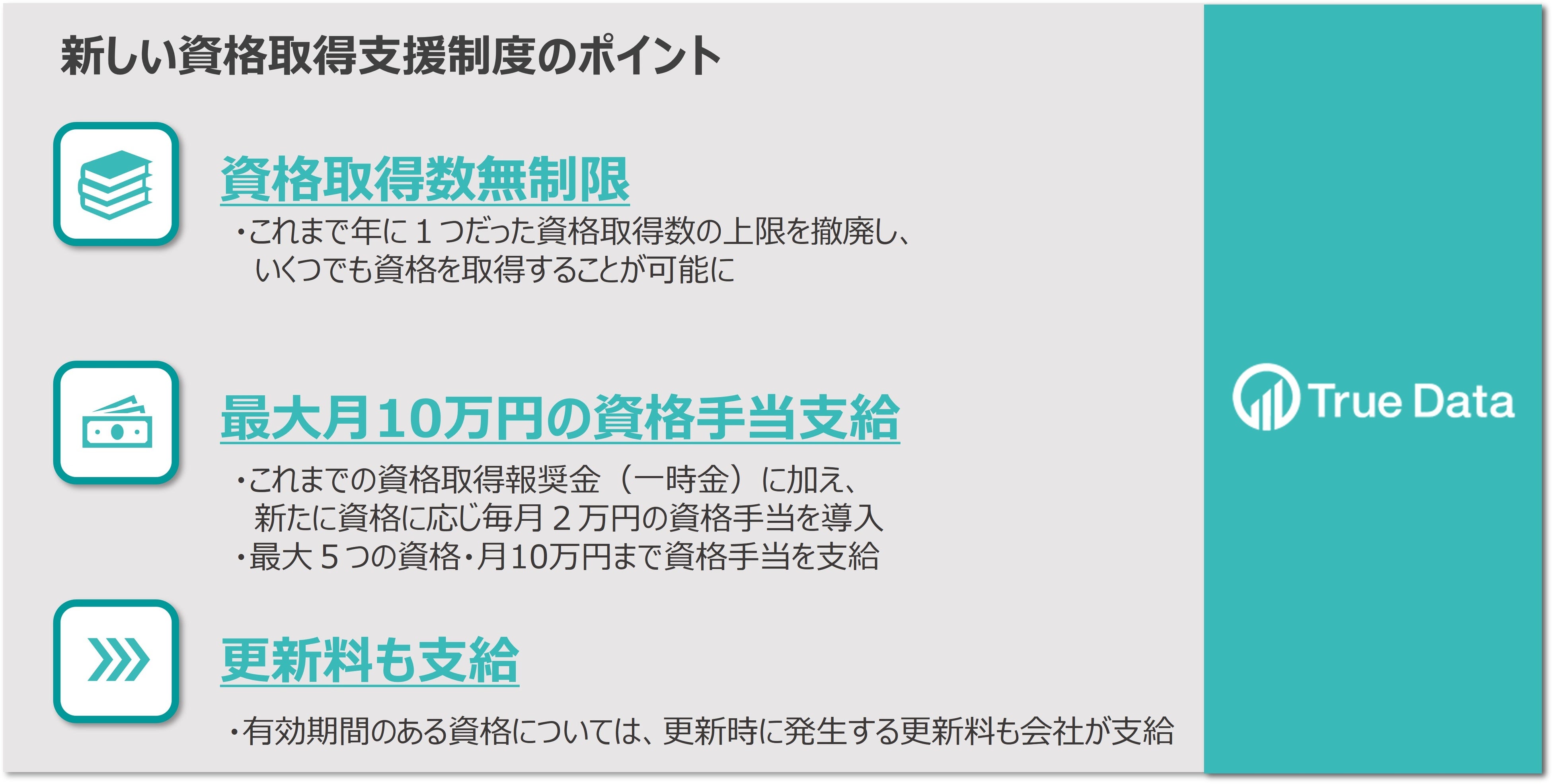 ビッグデータプラットフォームを運営する株式会社True Data(トゥルーデータ/本社:東京都港区、代表取締役社長:米倉 裕之)は、2022年8月より、統計やAI、クラウドなど業務に関連する資格の取得を支援する新たな社内制度を導入します。新しい支援制度では、対象となる資格を拡大し、これまで年に1件としていた取得資格数の上限を撤廃したほか、指定の資格を取得することで毎月最大10万円※が支給される「資格手当」を導入します。まずはエンジニアとデータサイエンティストを対象にスタートし、今後その他の職種へも拡大していく予定です。