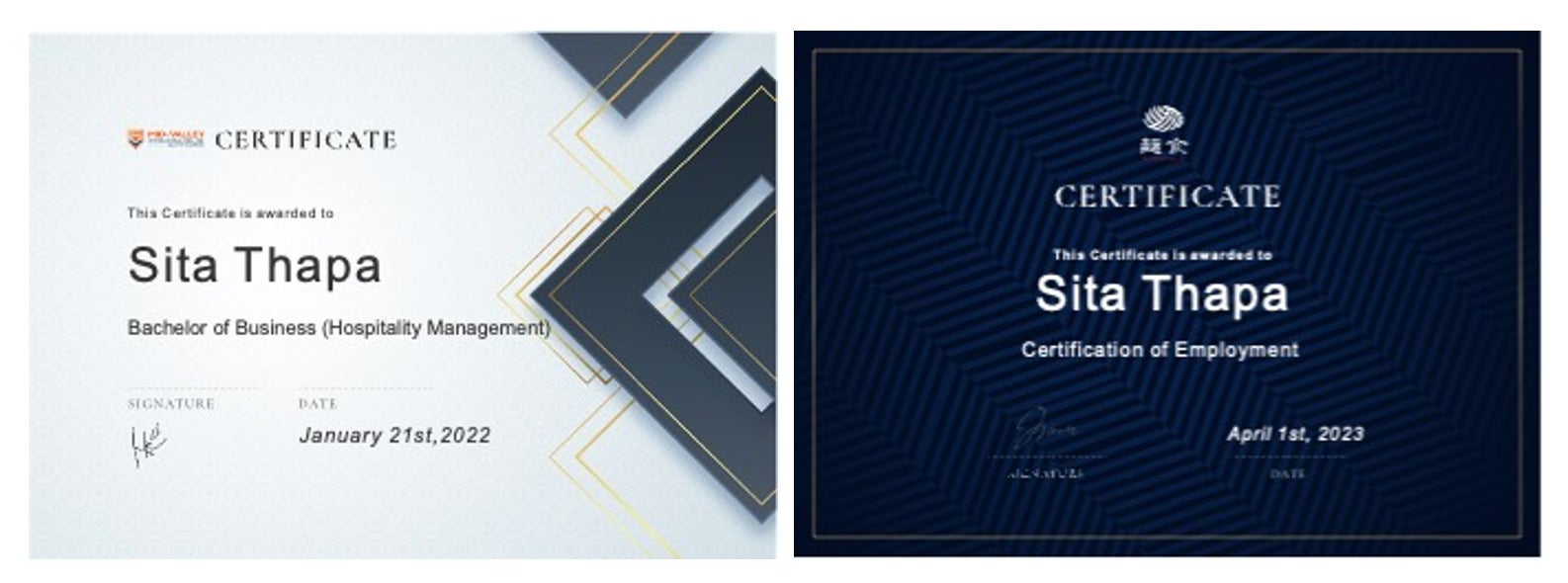 今回は、フォースバレーとネパールの私立大学「Mid-Valley International College(以下 ミッドバレー)」が開講した日本就職コース「Connect Job Class」を2022年に修了し、2023年4月に麺食に入社したネパール人卒業生に対して、各機関から「学位」と「職歴」に関する証明書が発行されました。