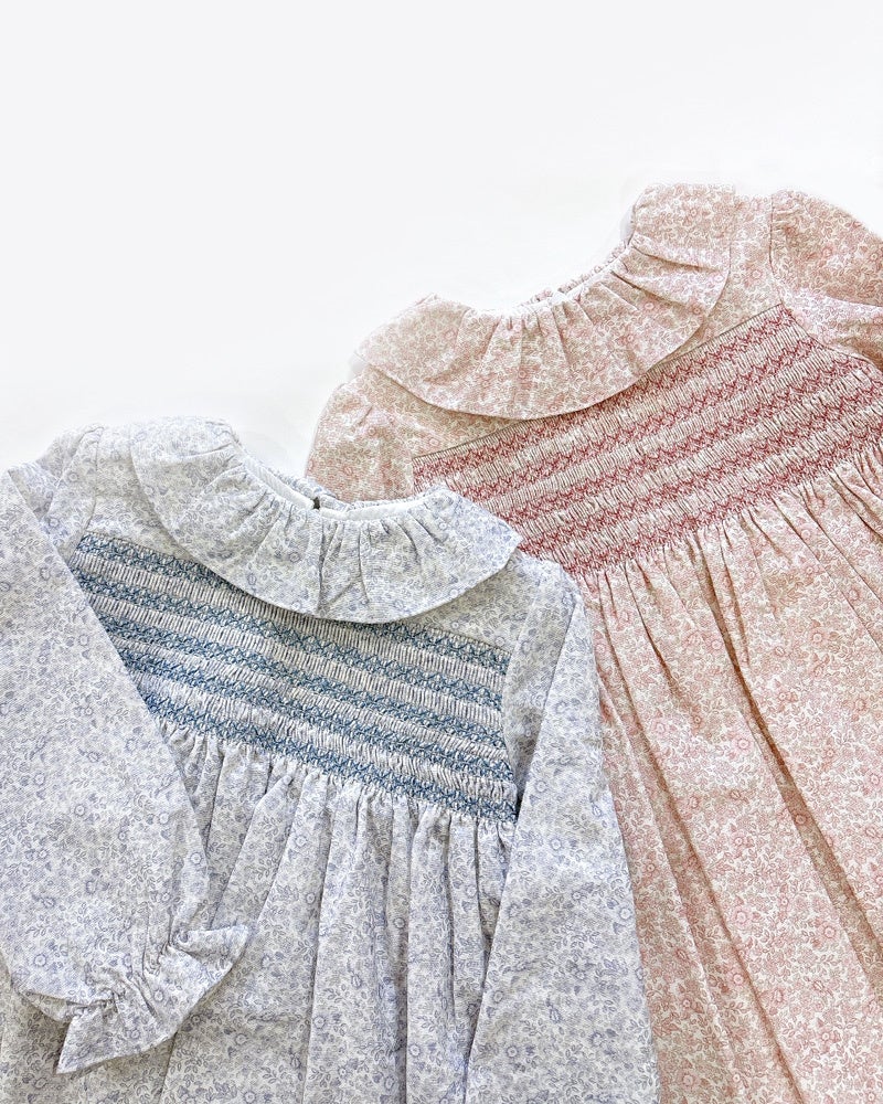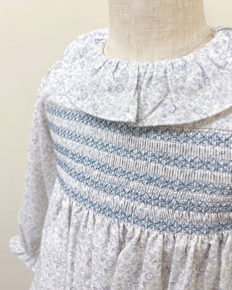 やわらかな色味の花柄に豪華に施されたスモッキング刺繍が上品。