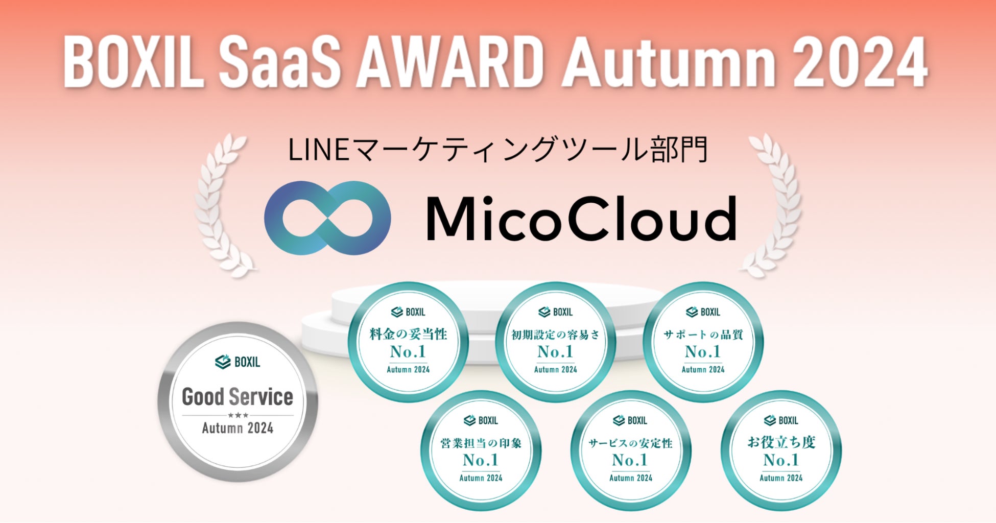 Micoworks株式会社(本社:大阪市北区、代表取締役:山田修、以下「当社」)が提供する、LINEを活用したマーケティングプラットフォーム「MicoCloud(ミコクラウド)」は、スマートキャンプ株式会社(以下「スマートキャンプ」)が主催する「BOXIL SaaS AWARD Autumn 2024」のLINEマーケティングツール部門で「Good Service」など7つの賞で選出されました。
