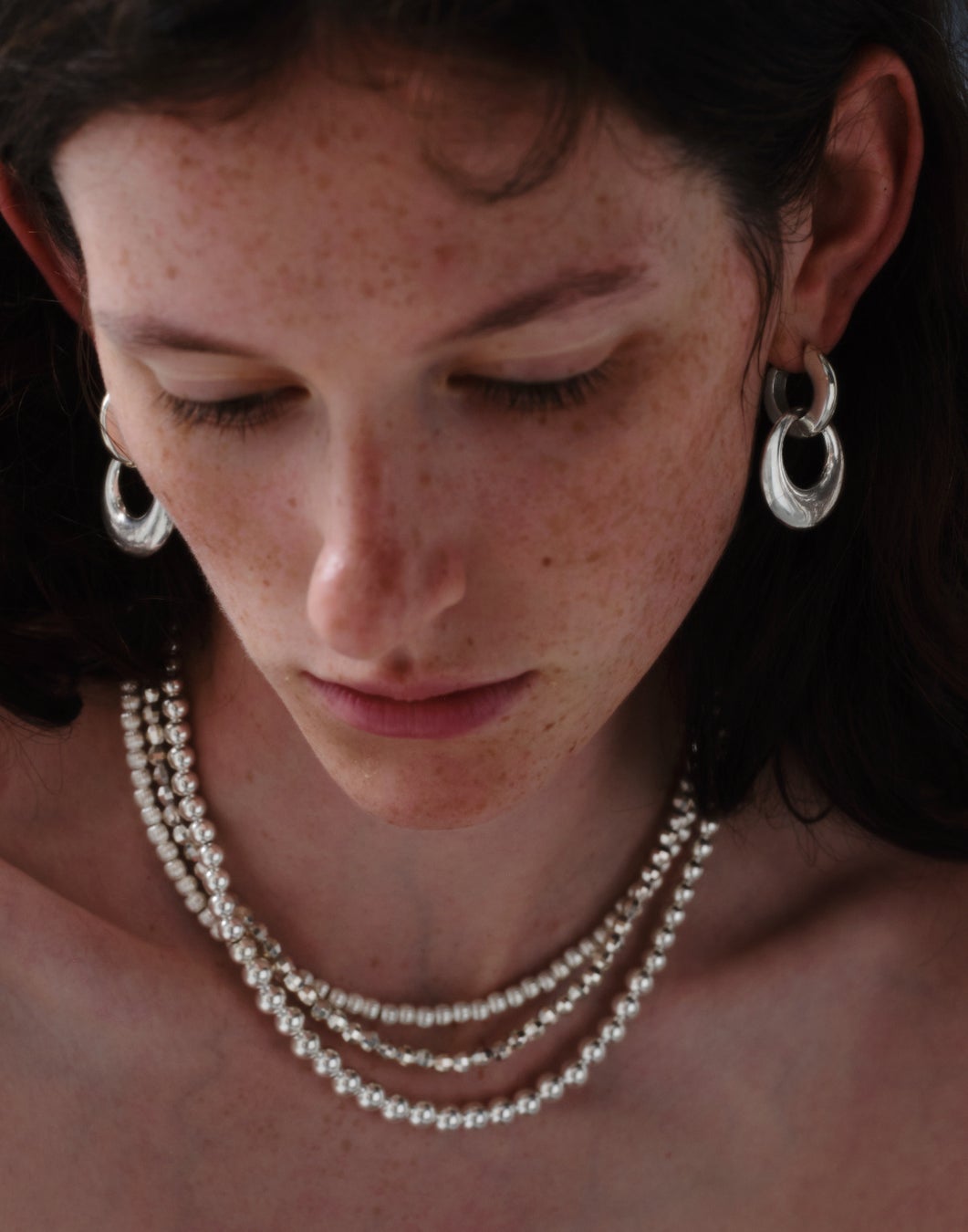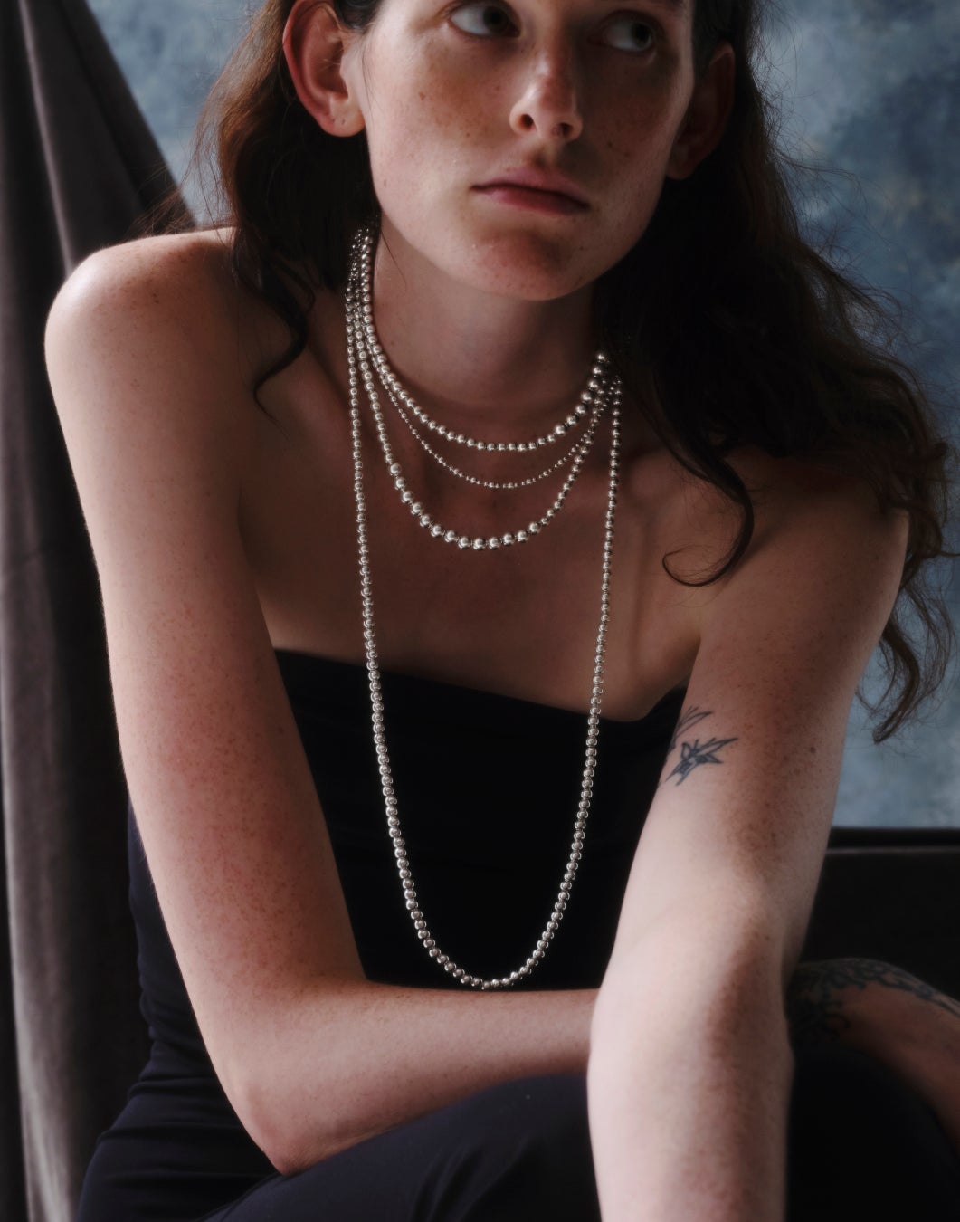 シルバーボールが連なるデザインが、ミニマルかつモードな表情を引き出すネックレスとロングネックレス。
