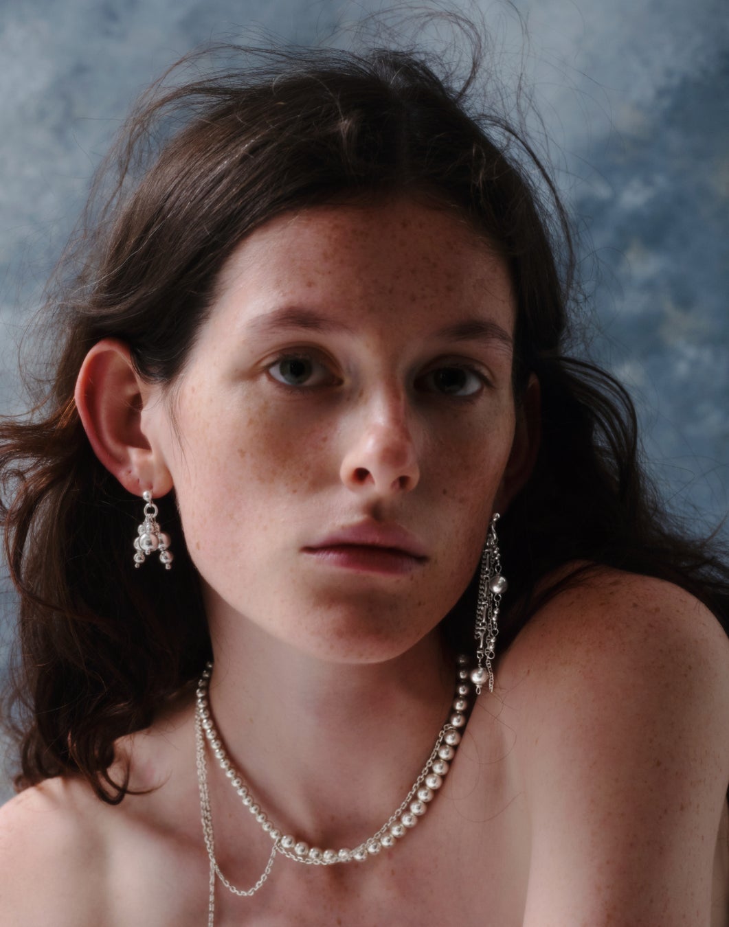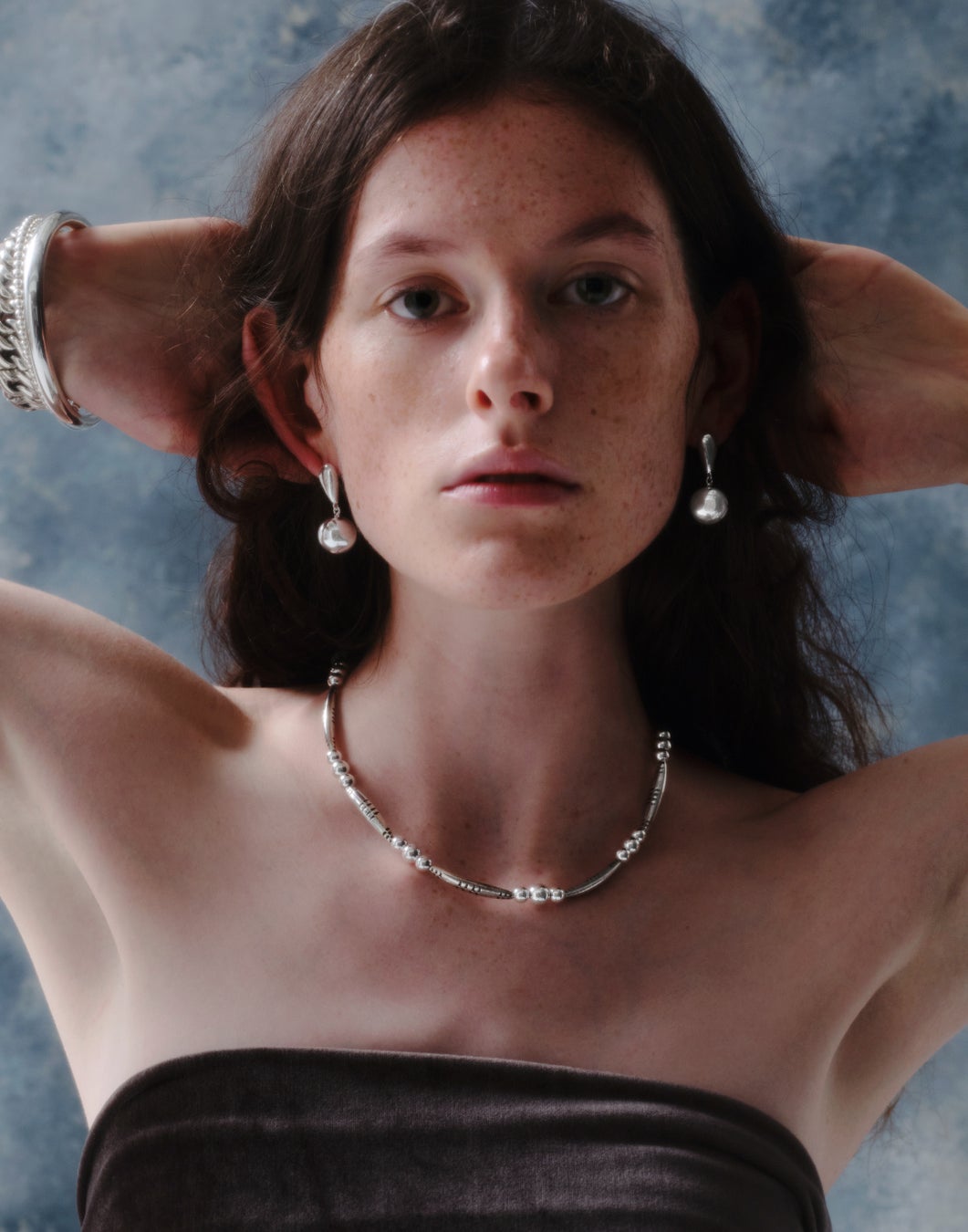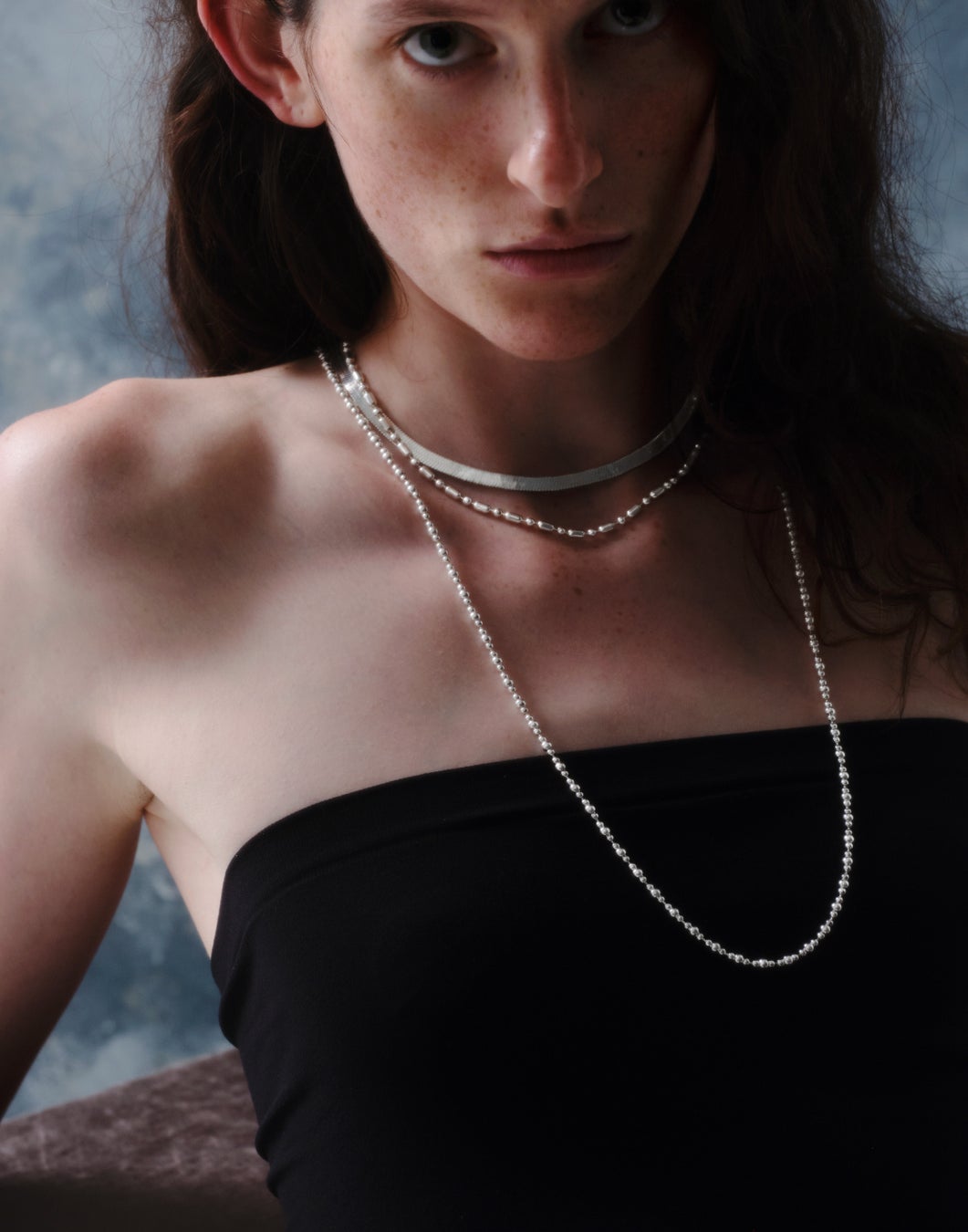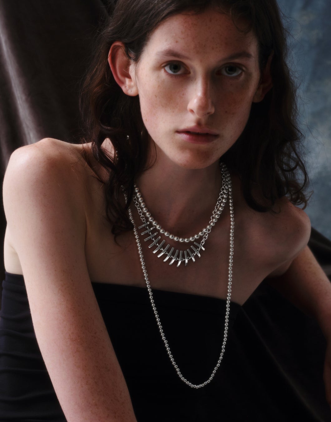 マットな質感のシルバーがデコルテに柔らかい輝きを添えます。