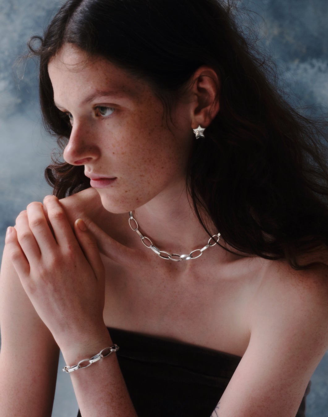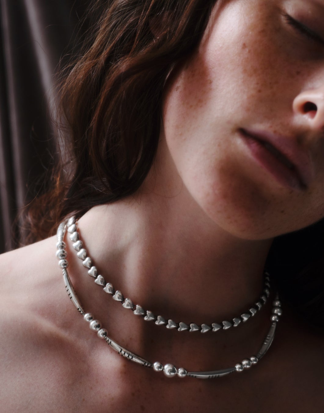 インディアンジュエリーからインスピレーションを受けた重厚感のあるチェーンネックレスとブレスレット。