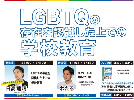 また、セミナー後半には教員向け映像教材(文部科学省特選)「LGBTsの子どもの命を守る学校の取組 ②当事者に寄り添うために ~教育現場での落とし穴~」を上映する予定です。
