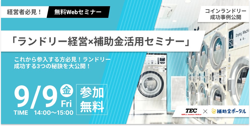 9月9日(金)14:00開催|無料ウェビナー「ランドリー経営×補助金活用セミナー」これから参入する方必見!ランドリー 成功する3つの秘訣を大公開!
