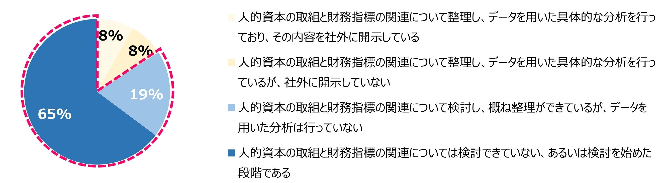 2つ目は「人的資本に係る取組みと財務指標との関連性の整理」です。7割近くの企業で、人的資本の取組と財務指標の関連を検討できておらず、8割以上の企業で関連性の分析ができていない状況となっています。人的資本の取組みが企業価値向上につながることをデータに基づき検証できている企業はまだ少数と言えるでしょう。