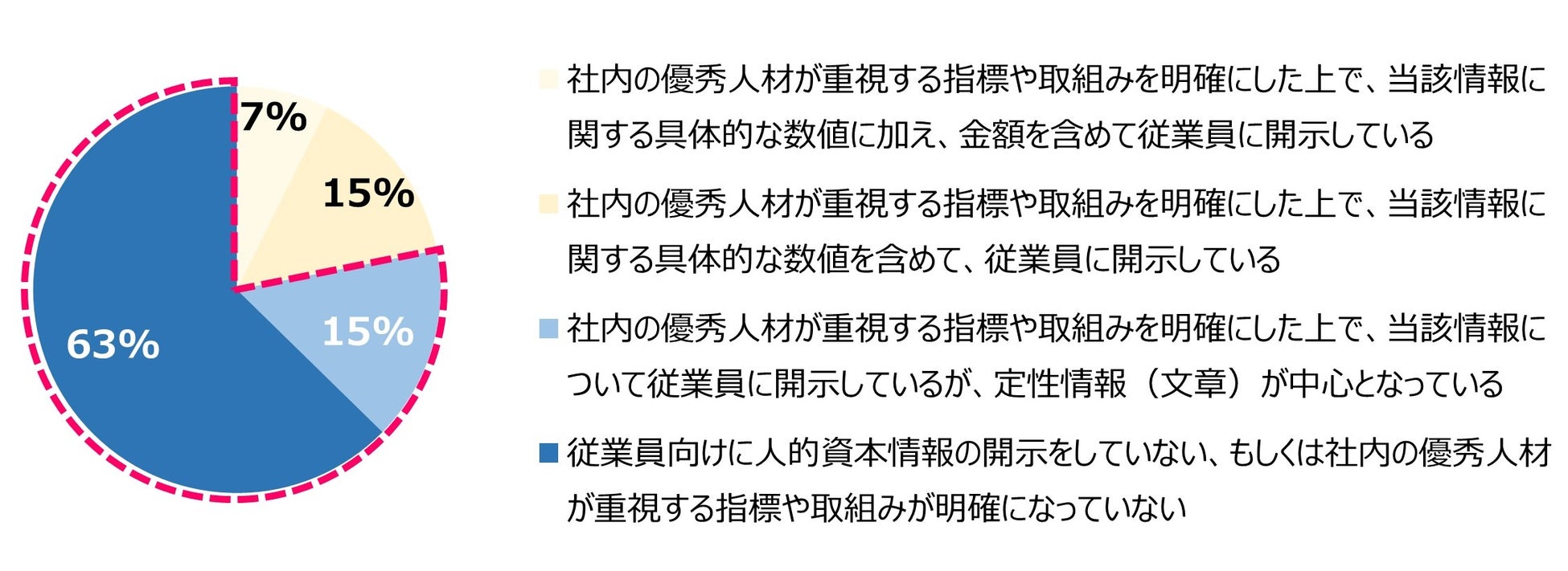 3つ目は「社内の優秀人材が重視する指標や取組みの開示」です。8割近くの企業で、優秀人材が重視する指標や取り組みについて、従業員に数値データで開示できていないことが分かりました。自社従業員のエンゲージメント向上のためにも、従業員向けの開示を今後充実させていく必要があることが示唆される結果となりました。