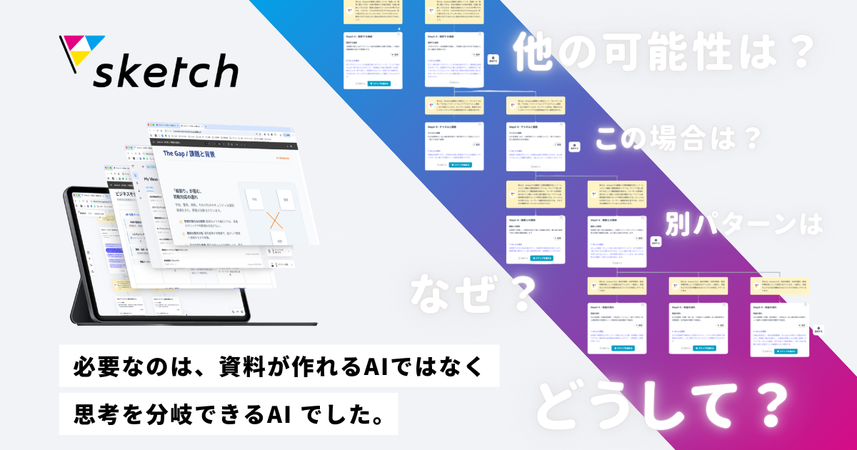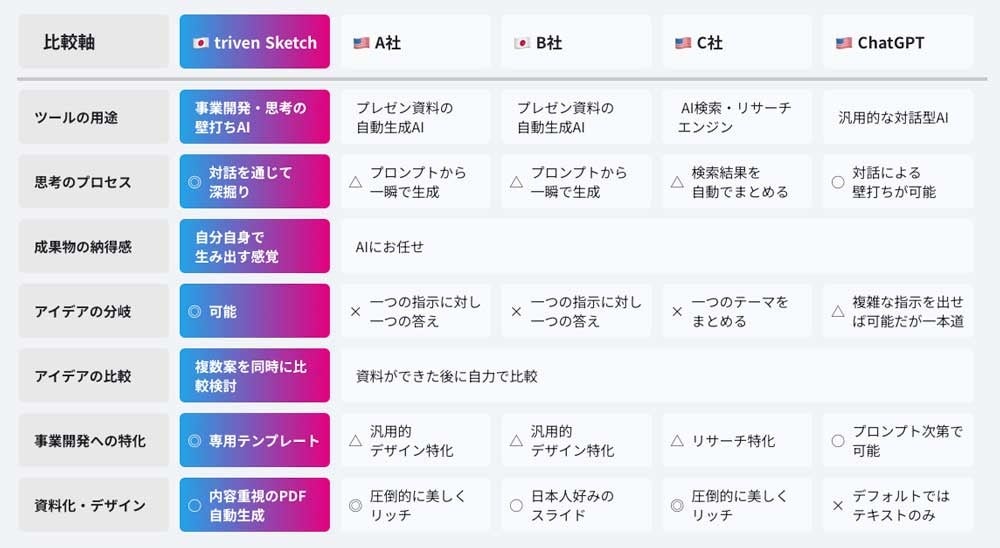 triven Sketchは、資料を「作らせる」ツールではありません。ユーザーの思考をAIと広げ、比較検討しながら「圧倒的な納得感」のあるビジネスを自分の手で生み出すためのAIです。