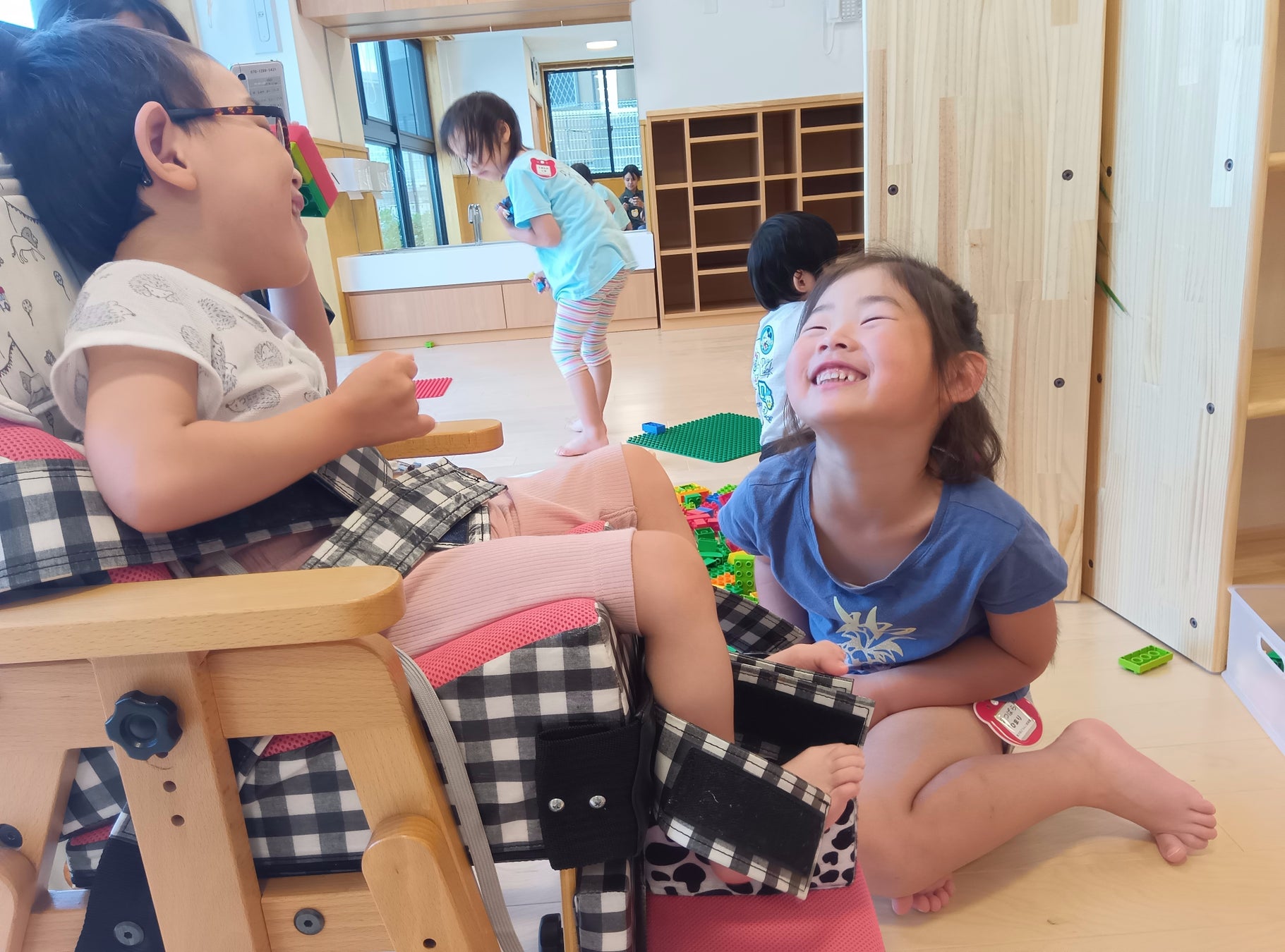 どろんこ会グループは常々、ただ施設が隣り合っているだけ、玄関もスタッフの事務所も別、子どもたちは週に1度、月に1度の交流のみといった、「形だけ」の併設は意味がないと考えてきました。保育園と発達支援の部屋を仕切る壁も取り払い、園庭内も双方を分けるフェンスなどもなく、全てをシェアし、障害の有無にかかわらず混ざり合って生活する。そして、双方のスタッフが保育園に通う子も児童発達支援に通う子も保育・支援することが「完全併設」だと考えています。