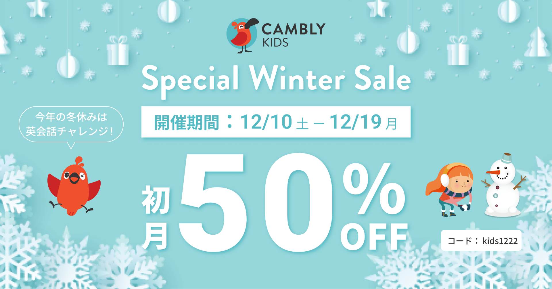 そんなCambly Kidsの英会話レッスンを、初月50%OFFでご利用いただけるSpecial Winterセールを12月10日(土)から12月19日(月)まで開催!ぜひこの冬休みを活用してお試しください!
