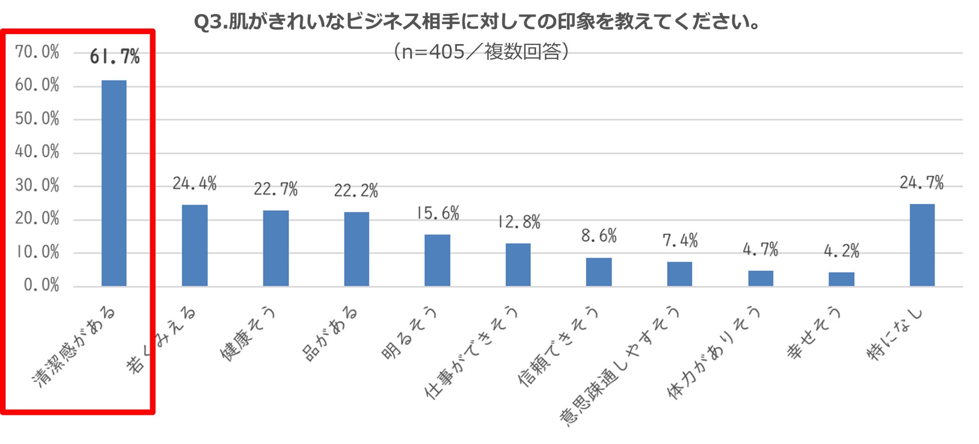 「肌がきれいなビジネス相手に対しての印象」は、”清潔感がある”が最多61.2%
