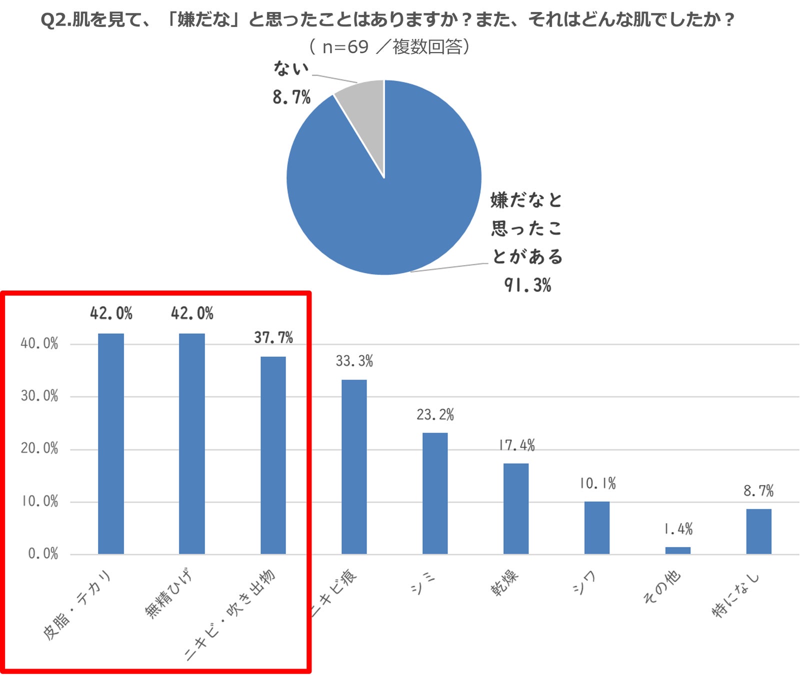 具体的には、「皮脂・テカリ」「無精ひげ」が最多の42.0%、次いで「ニキビ」37.7%という結果に。