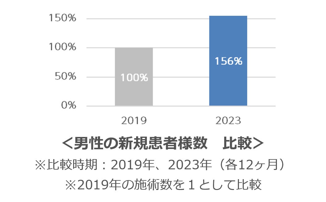 聖心美容クリニックでは、2019年~2023年の4年間で「美容皮膚科(スキンケア)」の施術を受ける男性の新規患者様は1.6倍に急増した。