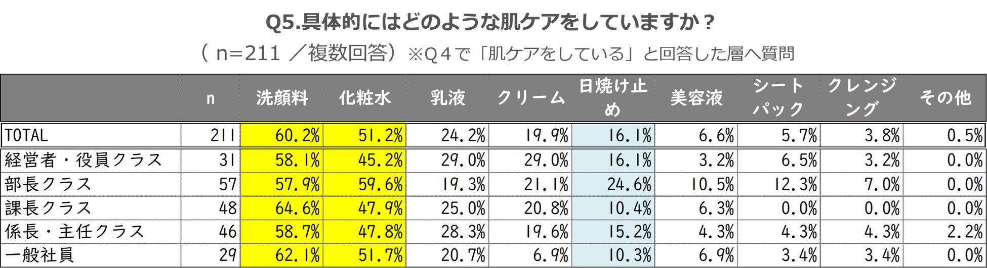 調査対象者の職位別に、肌ケア実施の有無を見てみると、係長以上では全ての職位で50%以上がスキンケアを実施。一方、一般社員のスキンケア率は3割程度と、役職者と比較して20~30ポイント前後の差があることが分かりました。