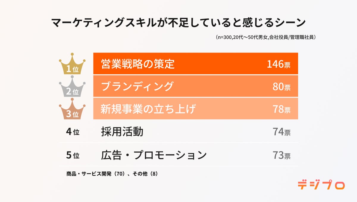 また、実際に所属する企業でマーケティングスキルが不足していると感じるシーンを調査したところ、以下のランキング表の結果になりました。最も多くの票を集めたのは「営業戦略の策定(146票)」。