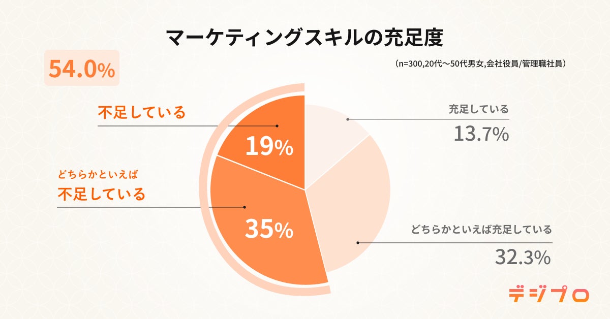 次に、マーケティングスキルの充足度を調査した結果、54.0%の企業が「マーケティングスキルは不足している」と回答しました。「どちらかといえば不足している」(35%)、「不足している」(19%)と感じる企業が過半数を占め、現場でのスキル不足が顕在化しています。一方で「充足している」との回答はわずか13.7%にとどまり、マーケティング人材育成の課題が浮き彫りとなりました。