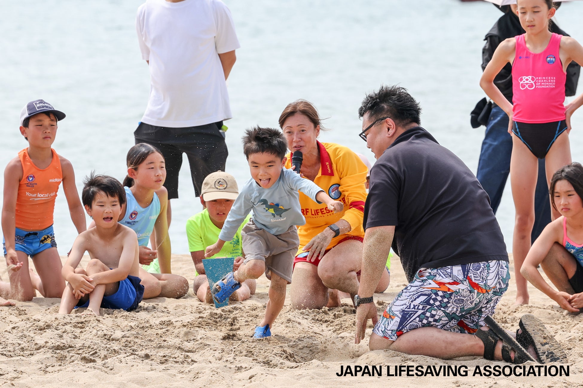 開催地ホストの京都府ライフセービング協会の主管で、ジュニアライフセービング体験も行われ、海や砂浜で、ライフセービングスポーツをライフセーバーと楽しんだ。このプログラムにはビオレUVから応援をいただき、参加者へ日やけ止めが提供された。