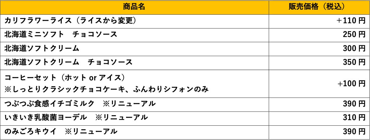 デザートメニューでは北海道ミニソフトにチョコソースがたっぷりとかかった「北海道ミニソフト チョコソース」と、北海道ミニソフトがビッグサイズになった「北海道ソフトクリーム」、「北海道ソフトクリーム チョコソース」*の3種類の仲間が新たに登場します。また、しっとりクラシックチョコケーキ、ふんわりシフォンにプラス100円(税込)でコーヒー(ホットorアイス)セットにできるようになり、単品で注文するよりもお得になります。