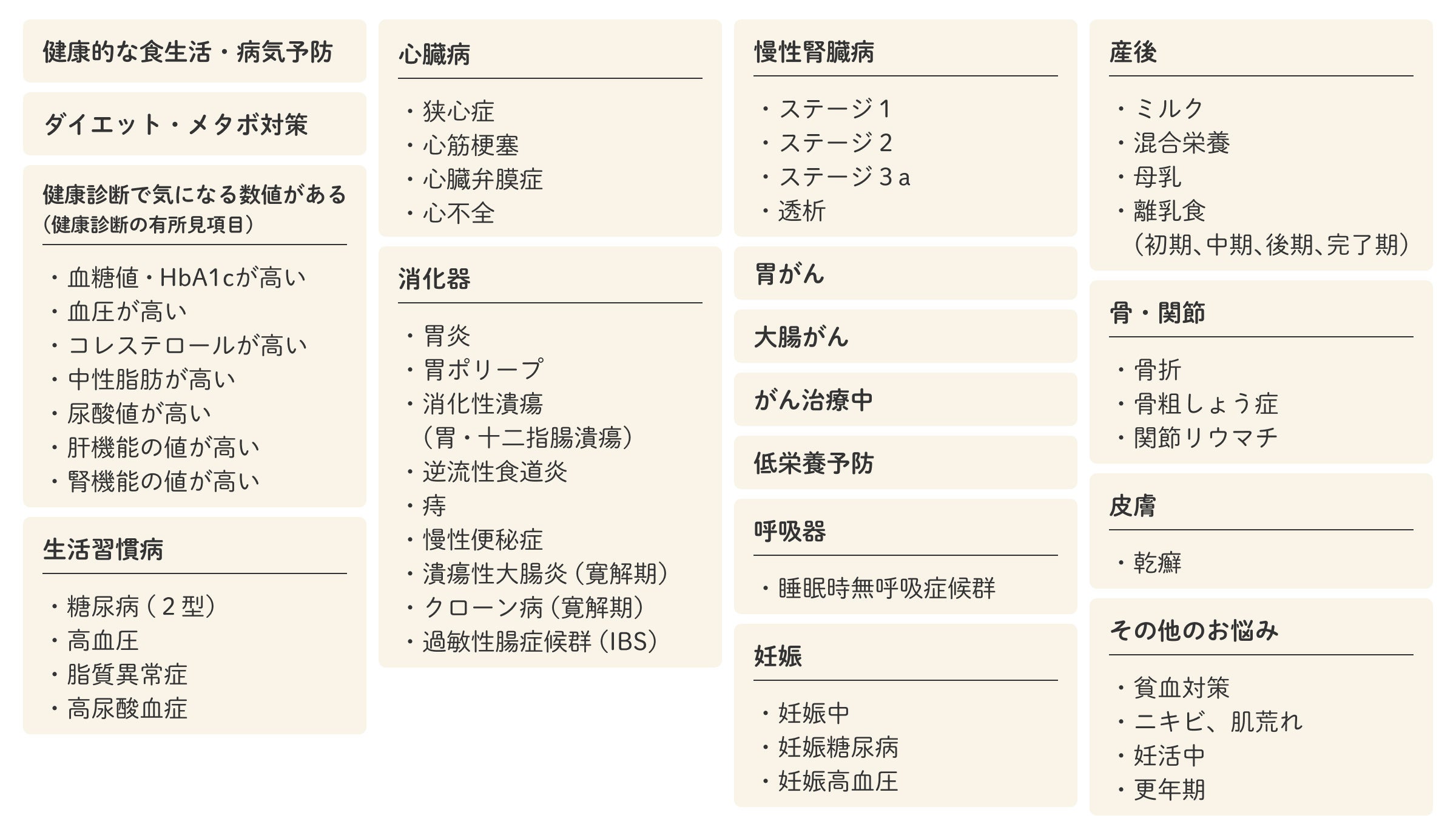 現在、計70種類の健康テーマ・疾患の食事管理支援に対応しております。
