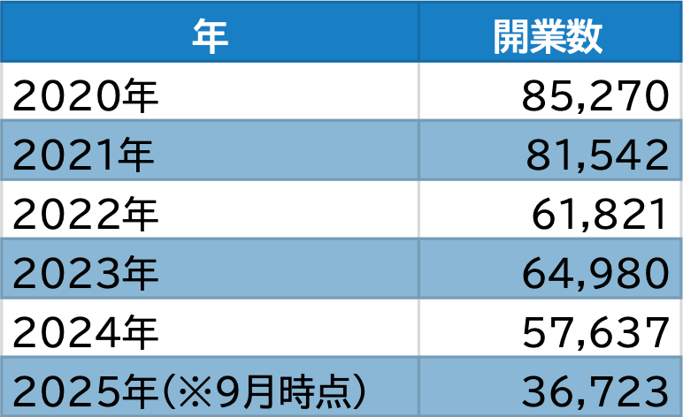 「開業ラッシュ」と言われる中でも、実際にはコロナ禍前(2020年)から約3割減の水準にとどまっています。