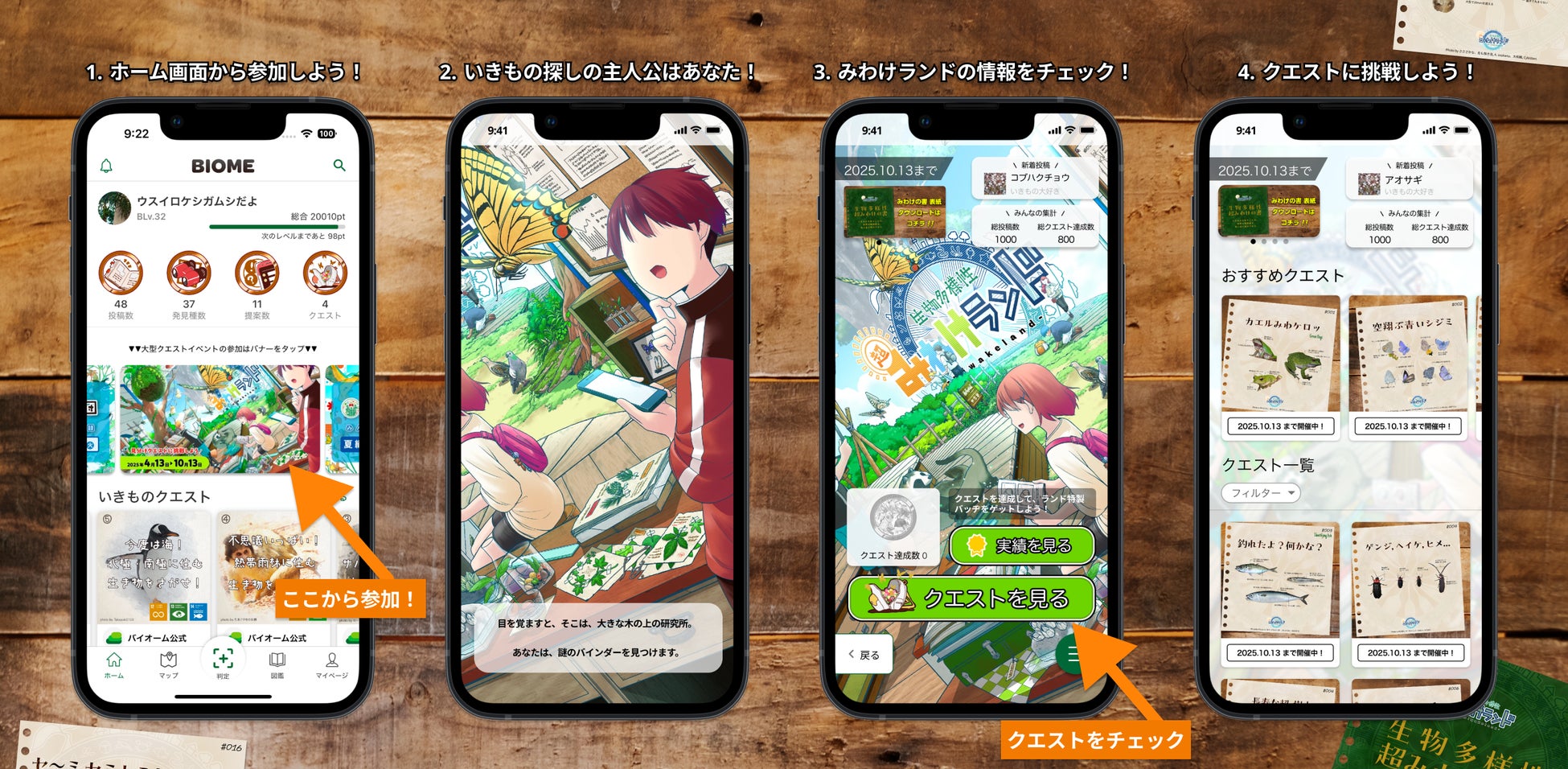 「生物多様性 超みわけランド」(以下、「みわけランド」)は、いきものコレクションアプリ「Biome(バイオーム)」を使って、身近ないきものの見分け方を楽しく学ぶことができるアプリイベントです。