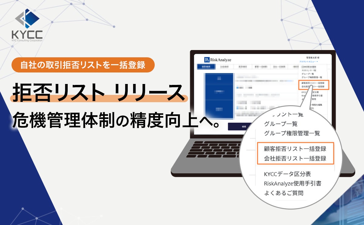 KYCコンサルティング株式会社(本社:東京都千代田区、代表取締役社長:飛内尚正、以下KYCC)が開発・提供する反社・コンプライアンスチェックツール「RiskAnalyze(リスクアナライズ)」は、2025年7月より新たに「拒否リスト機能」をリリースいたしました。