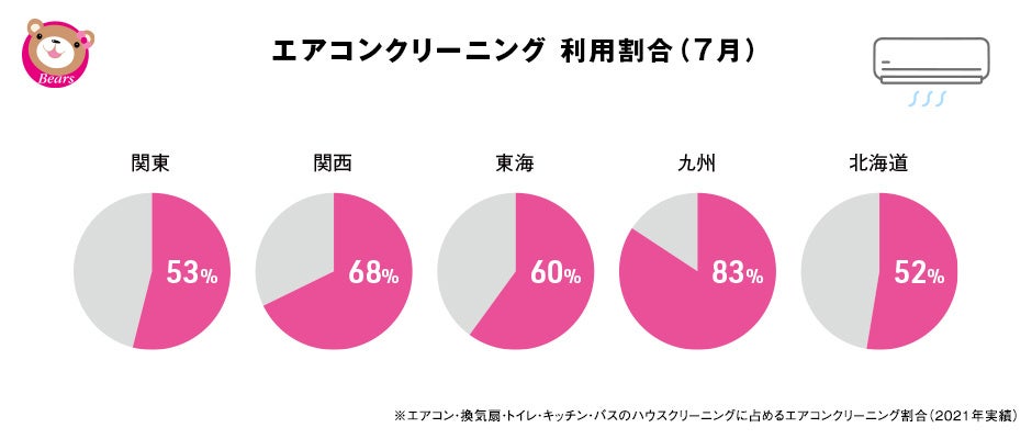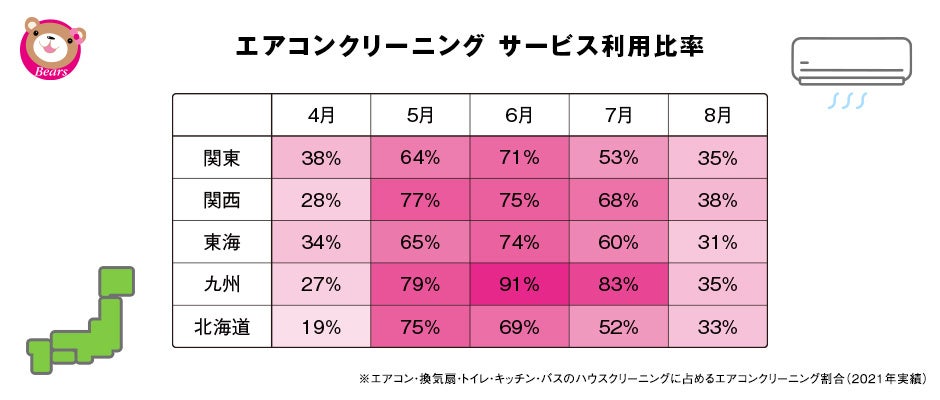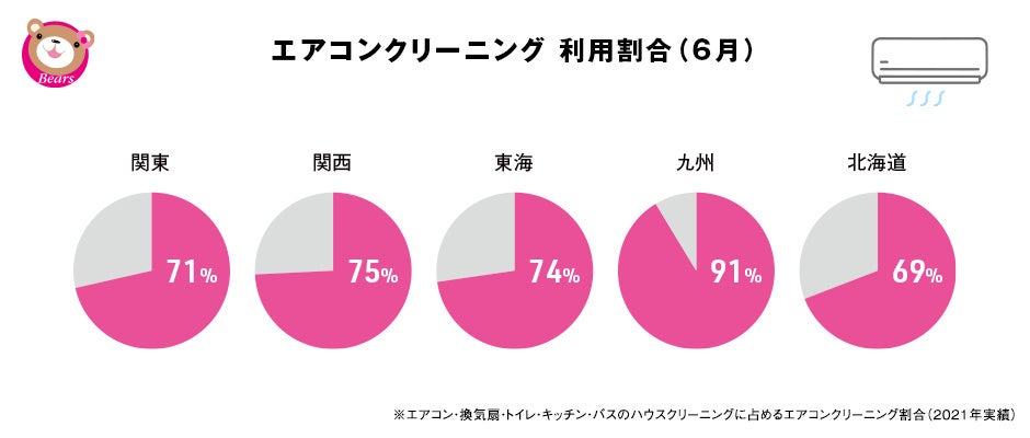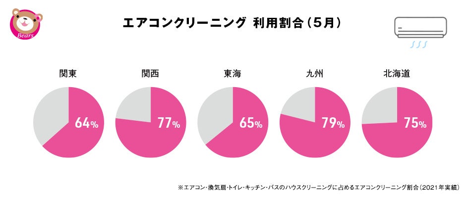 ベアーズでは、2021年のハウスクリーニング施工実績をもとに、エアコンクリーニングトレンド2022を発表しました。夏に行われるイメージの強いエアコンクリーニングですが、弊社の調査では関西・北海道では5月、関東・東海・九州では6月に実施のピークを迎えているなど、前倒し傾向が広がっていることが明らかになりました。