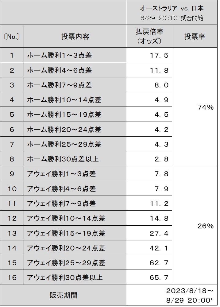 ・第3戦(vs オーストラリア)の日本の勝利予想は、26%※2。人気の投票は、30点差以上でオーストラリア勝利で、払戻倍率(オッズ)は2.8倍!