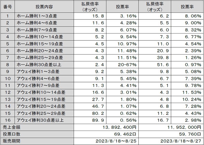 ※1 8月28日(月)10時時点の投票状況となります。払戻倍率(オッズ)は、投票状況により販売終了まで変動します。払戻倍率(オッズ)は、スポーツくじオフィシャルサイト(https://www.toto-dream.com/)で随時更新しています。