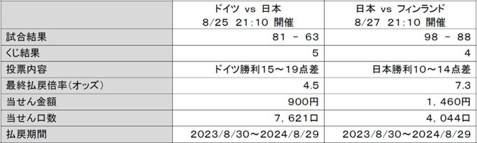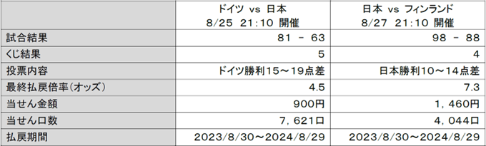 ■「WINNERバスケ1試合予想(ドイツ vs 日本)、(日本 vs フィンランド)」くじ結果