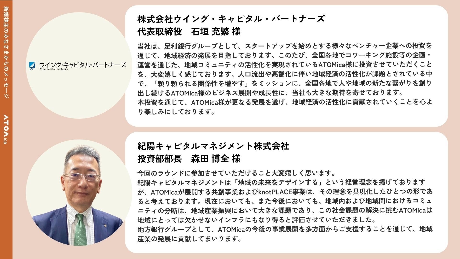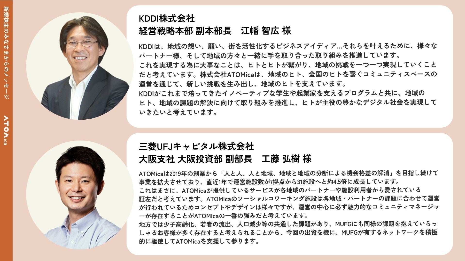 今回の資金調達を通じて、ソーシャルコワーキング®の更なる価値向上に加え、創業当初より構想を進めておりましたプラットフォーム事業構築に注力し、より多くの地域とそこに住む方々に出会いの価値を届けてまいります。