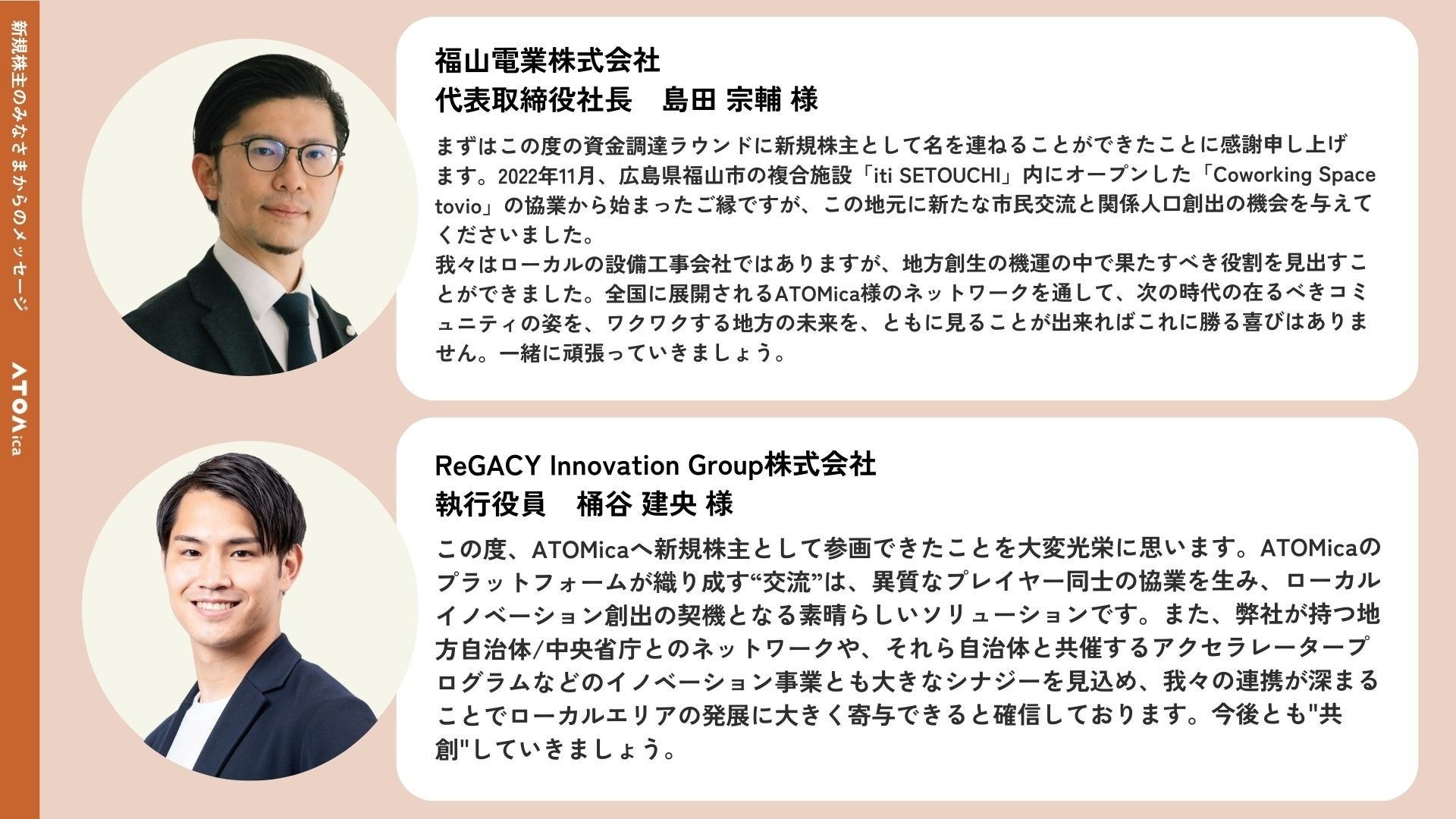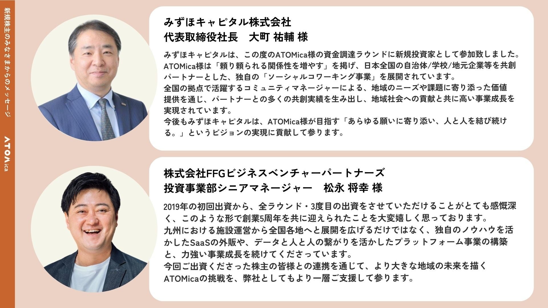 全国各地でソーシャルコワーキング®を展開する株式会社ATOMica(本社:宮崎県宮崎市、代表取締役:嶋田 瑞生、南原 一輝、以下ATOMica)は、プレシリーズBラウンドにて、31VENTURES Global Innovation Fund2号(グローバル・ブレイン株式会社が運営する、三井不動産株式会社のコーポレートベンチャーキャピタルファンド)をリードインベスターとし、Life Design Fund(イオンモール株式会社およびイグニション・ポイント ベンチャーパートナーズ株式会社が共同運営するベンチャーキャピタル)、 KDDI Regional Initiatives Fund1号(グローバル・ブレイン株式会社が運営する、KDDI株式会社のコーポレートベンチャーキャピタルファンド)を主な引受先とする第三者割当増資により、6.5億円の資金調達を実施いたしました。新規・既存株主の皆さまとの更なる共創を通じて、人と人を結び続けるプラットフォームを全国各地に構築してまいります。