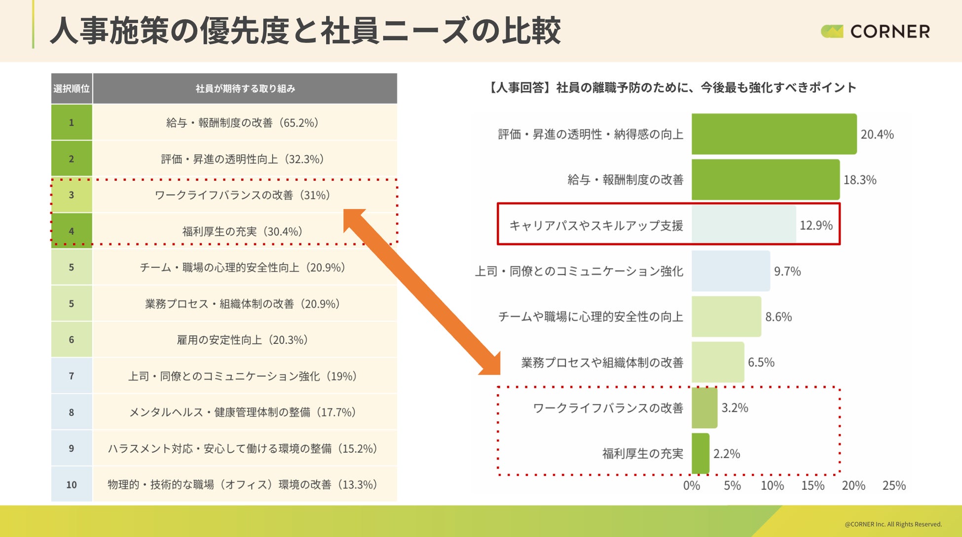 ・人事が離職防止のために最も優先する取り組みは「評価基準の透明性」で、「給与・報酬」「キャリア支援」が続く。社員が重視する働き方の柔軟性や福利厚生は優先度が低いため、優先順位にズレが生じている。