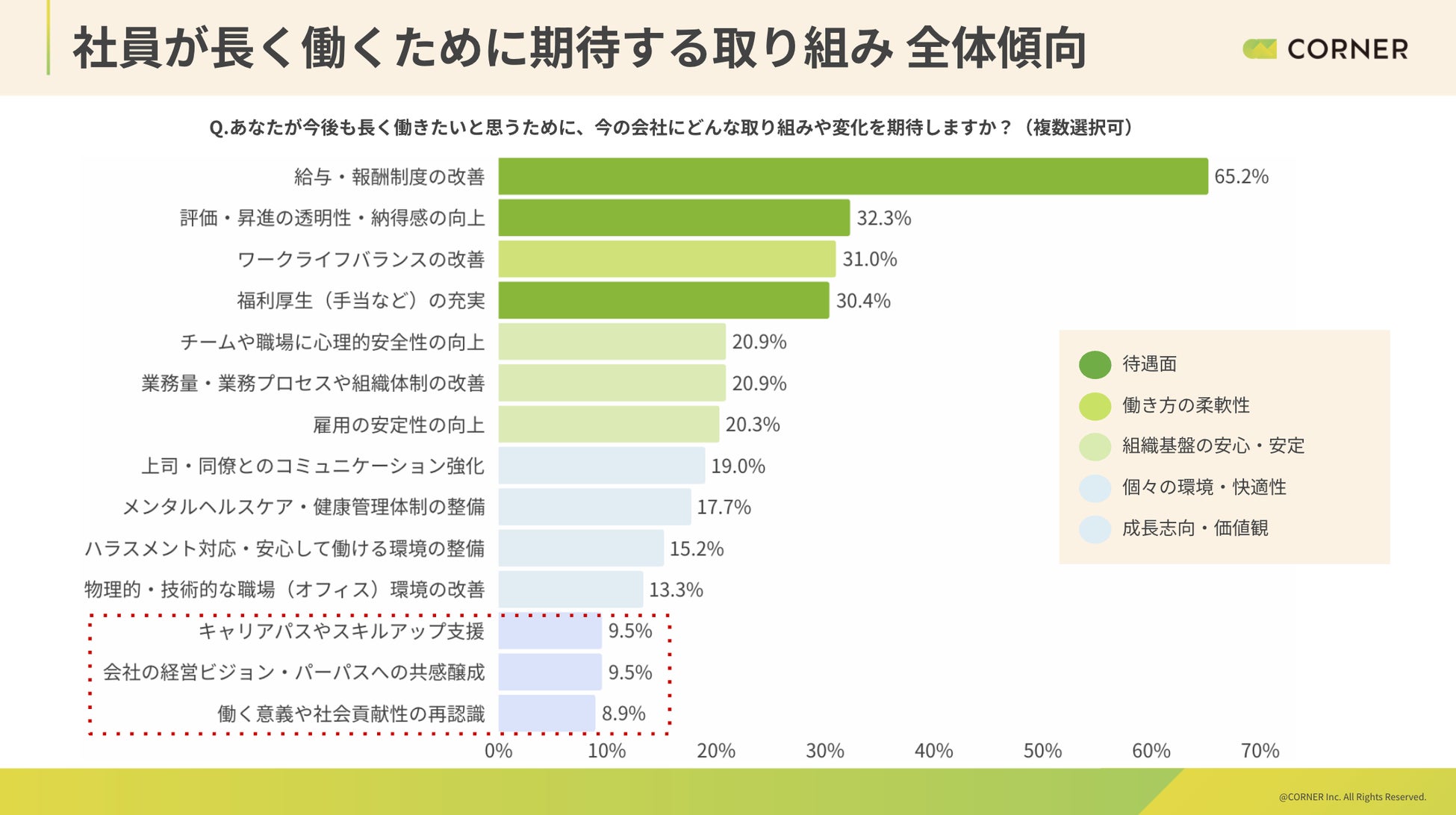 社員に対して、「長く働くために会社に期待する取り組み」を質問したところ、65%が「給与・報酬」改善を選択。次に「評価基準の透明性」、「ワークライフバランス確保」が続き、納得感や生活の充実を求める声が強いことを示している。安心感・業務のしやすさに関連するニーズもあがっているが、個人の環境よりも、組織運営や制度面の基盤への期待がより高くなっている。